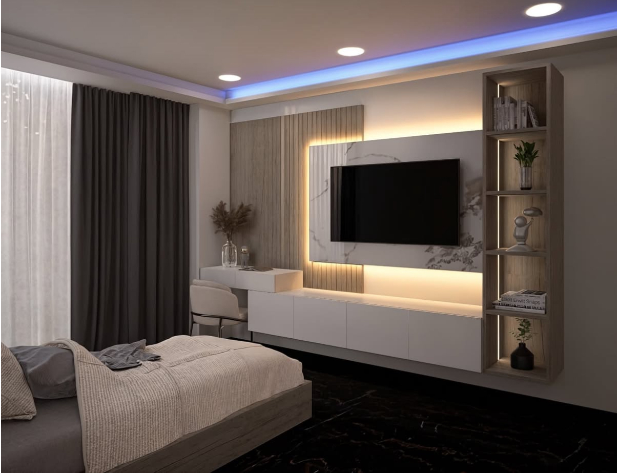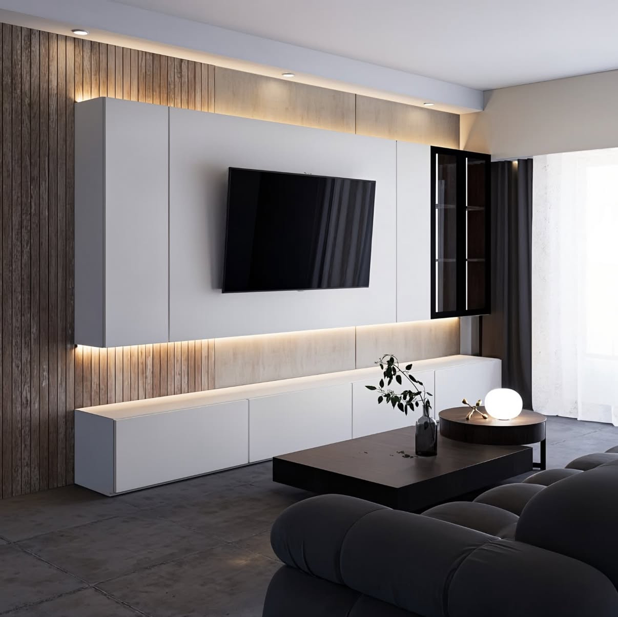 Desde paneles listonados hasta placas laqueadas con efecto mármol, pasando por nichos abiertos, biblio-modulares, cajones ocultos y luces LED cálidas o neutras, cada propuesta está pensada para adaptarse al uso diario sin renunciar al diseño.