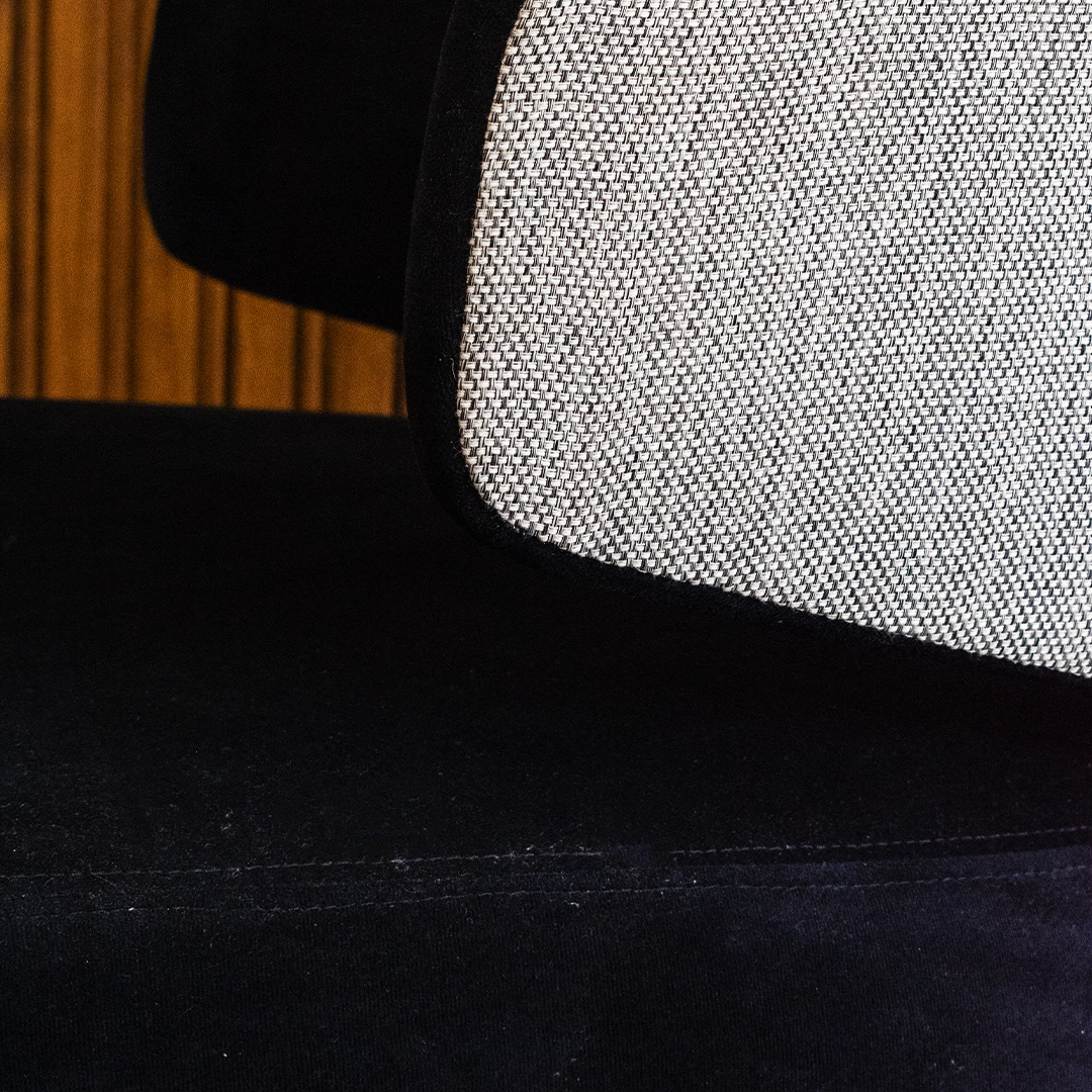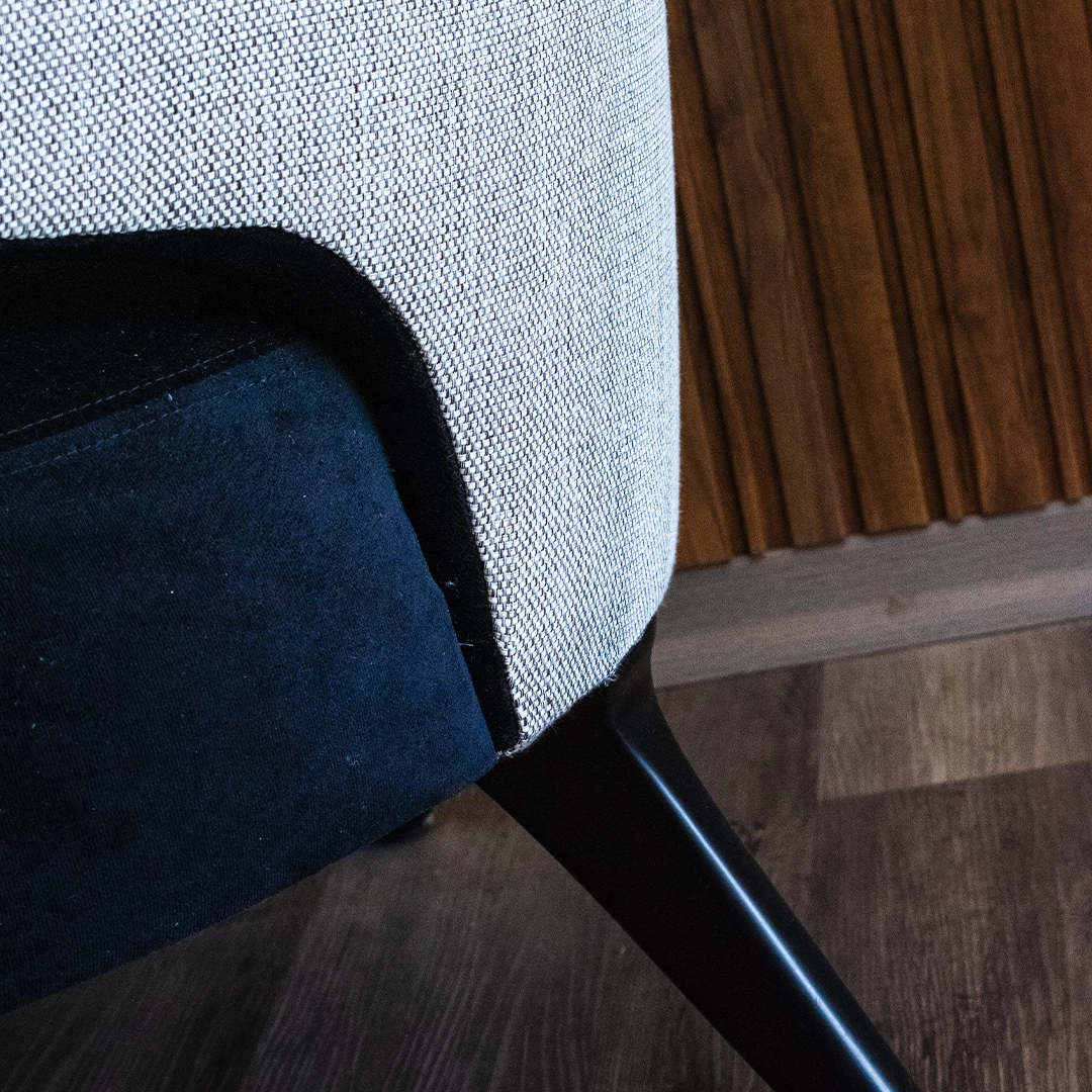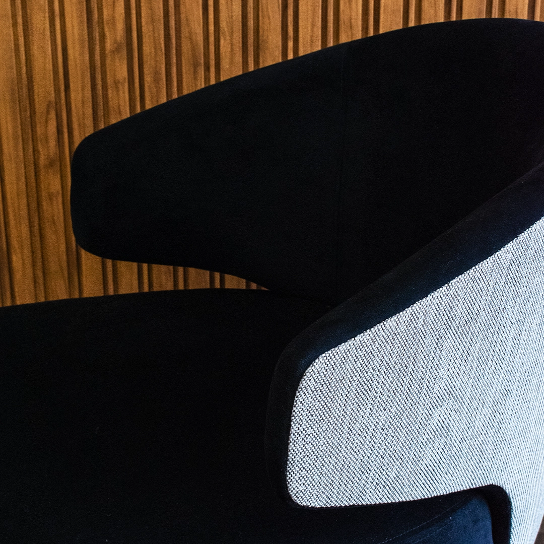 Las patas de madera en tono negro aportan solidez estructural y un contraste sutil que realza el diseño general, manteniendo una estética refinada y contemporánea.