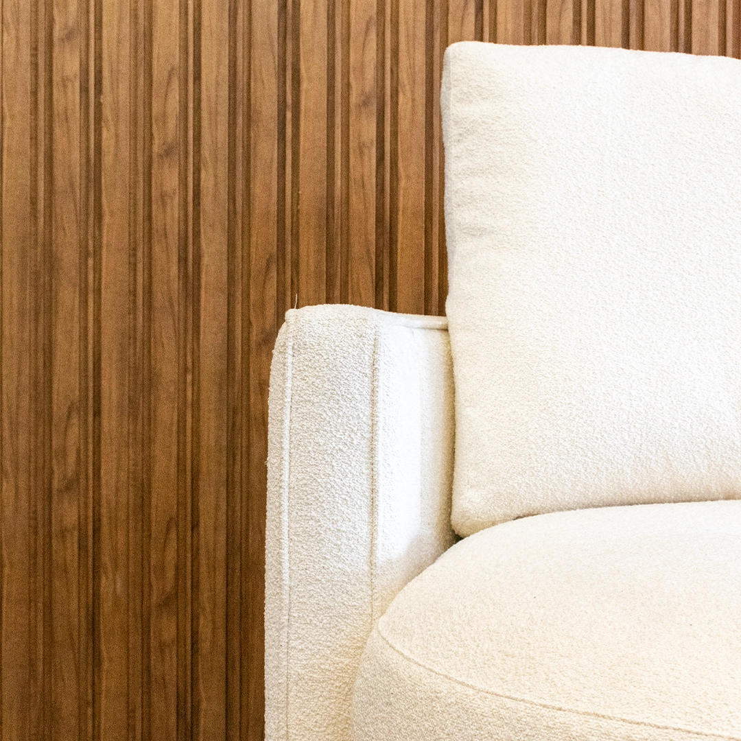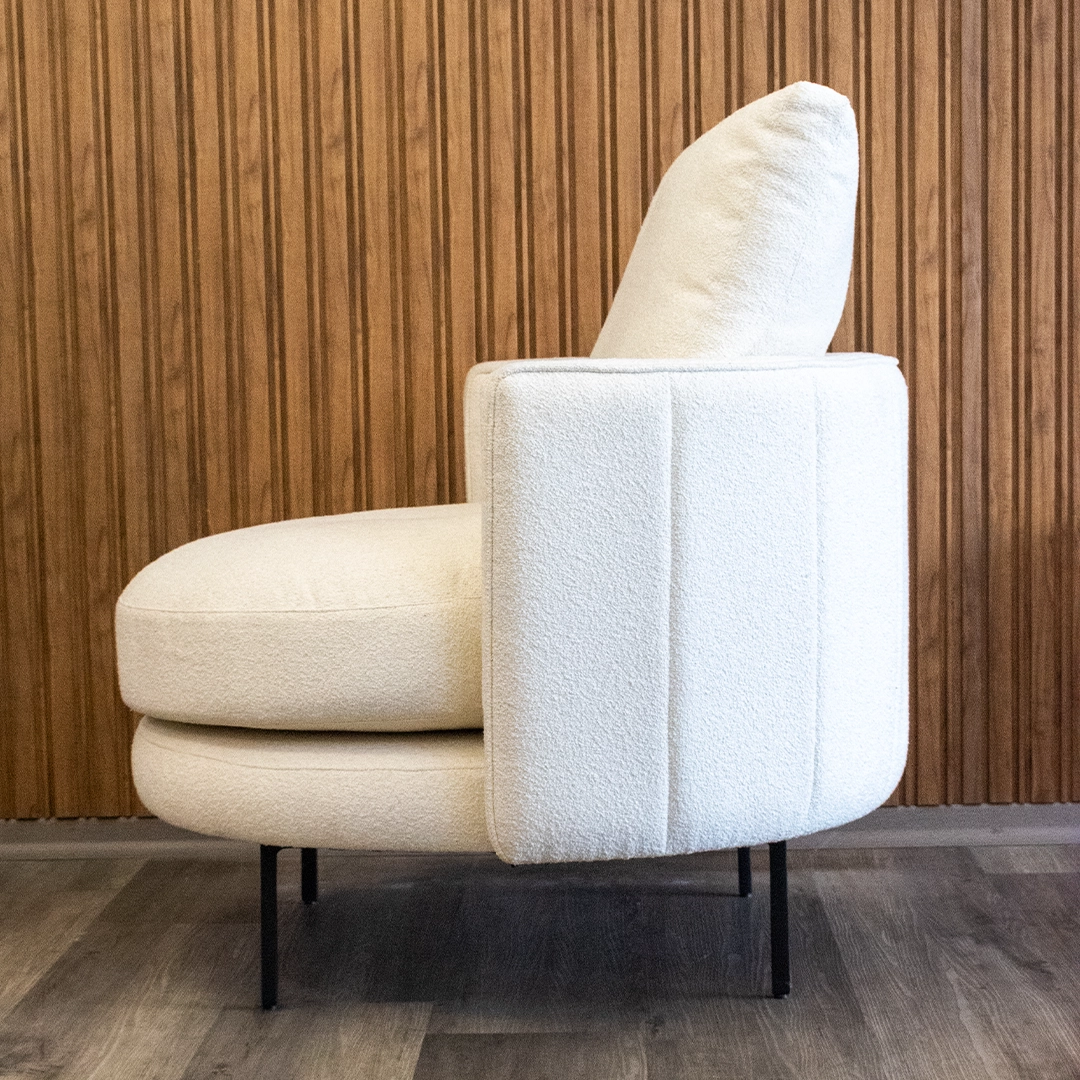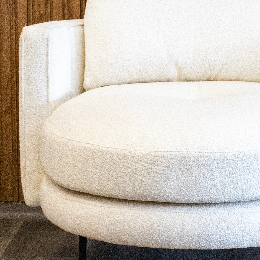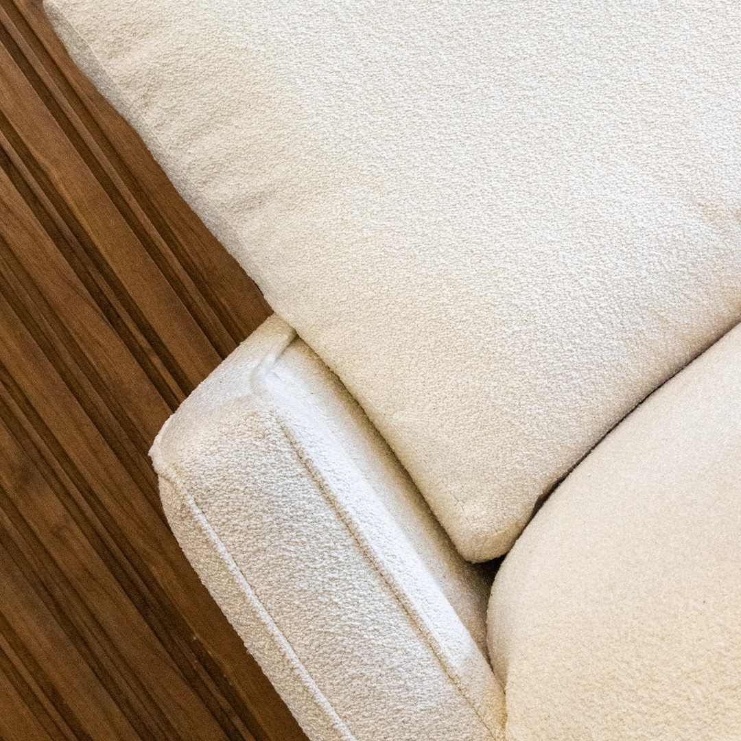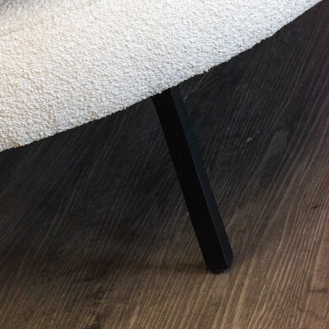 El tapizado en tela bouclé aporta textura y elegancia, con una trama cálida y suave al tacto que responde a las últimas tendencias en interiorismo. Este material no solo brinda una experiencia visual y sensorial sofisticada, sino que también ofrece buena resistencia al uso diario.
