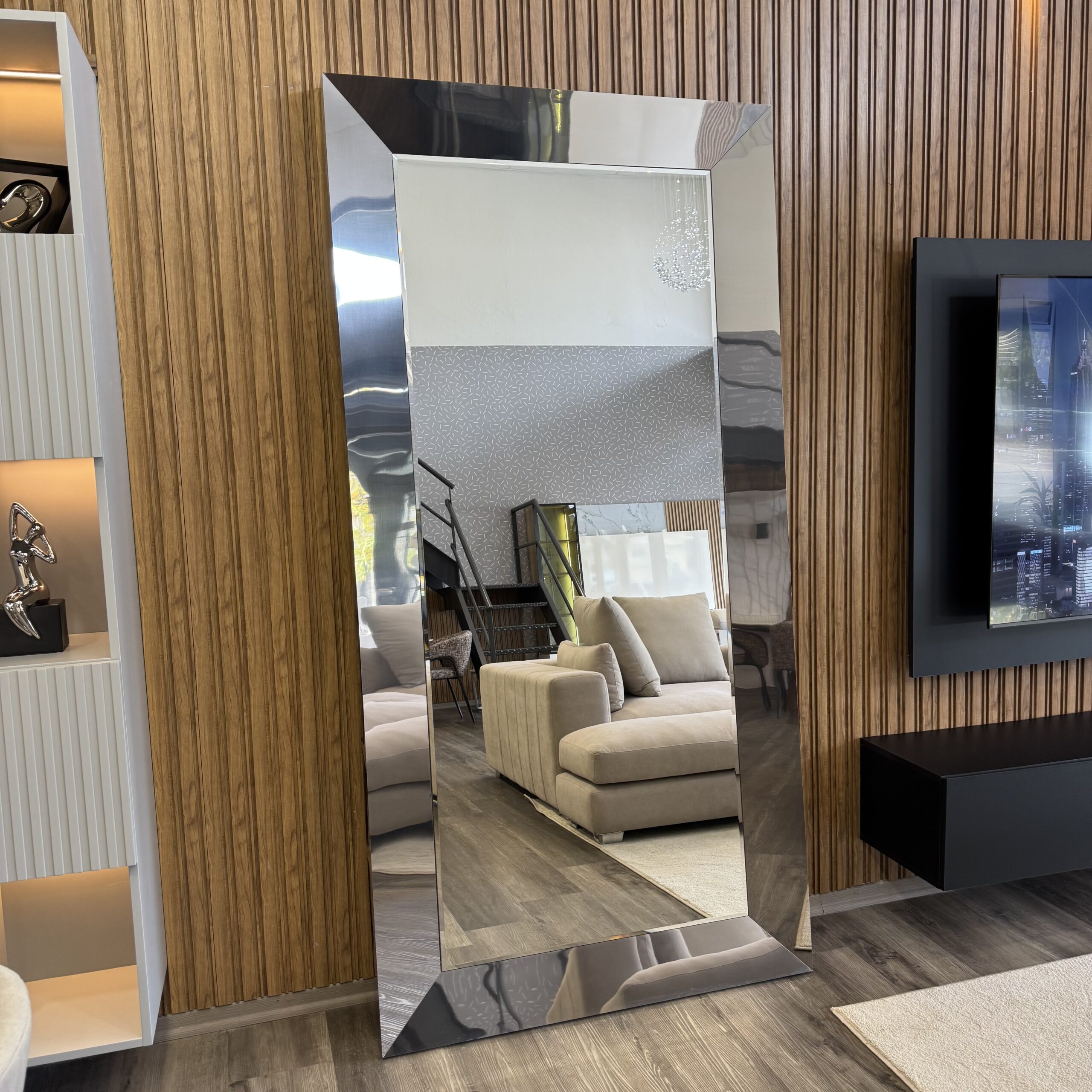 Dale un toque de diseño, amplitud y luminosidad a tus espacios con este elegante espejo de pie moderno. Fabricado con una sólida estructura de madera y revestido en acero pulido, este espejo combina resistencia y estética premium en una sola pieza.