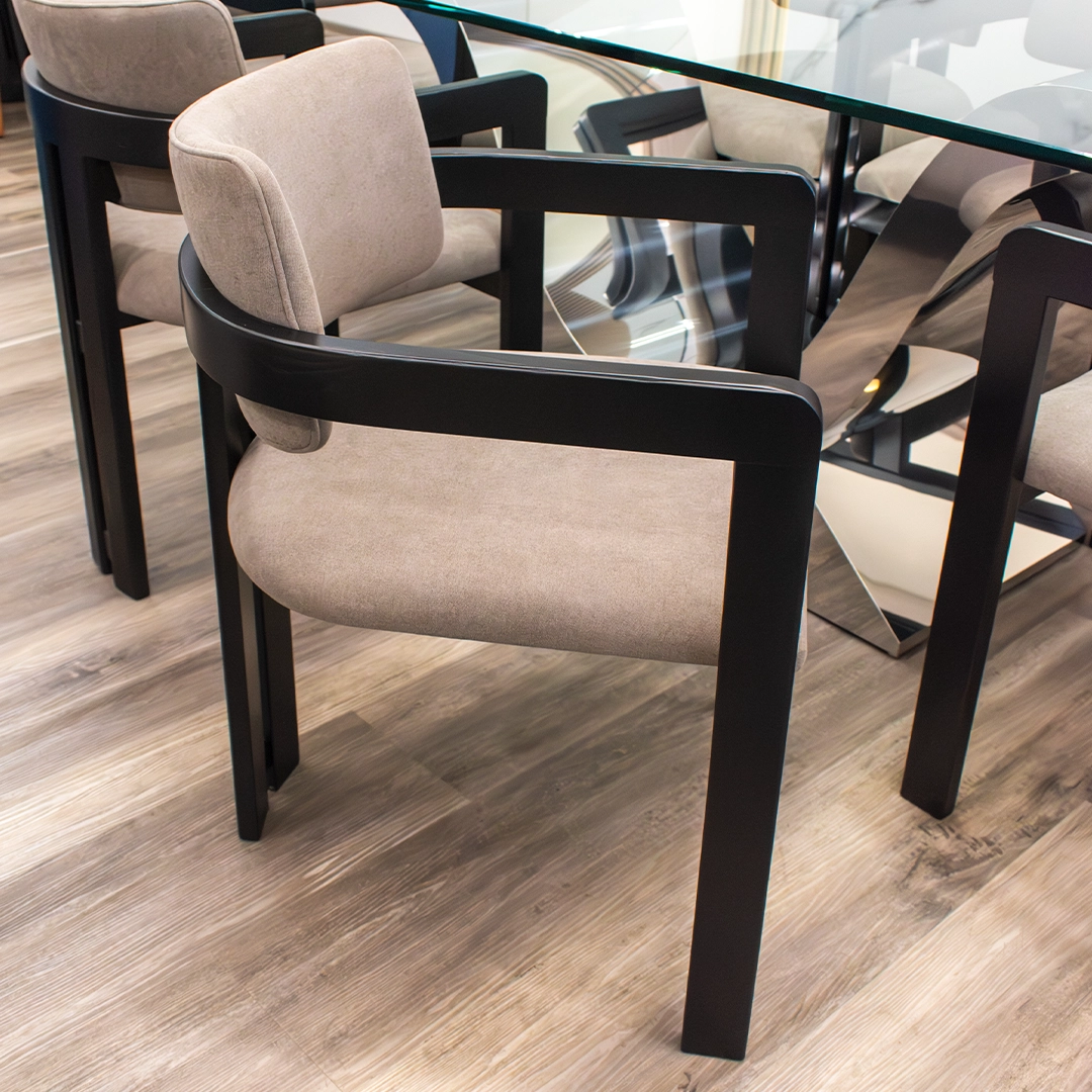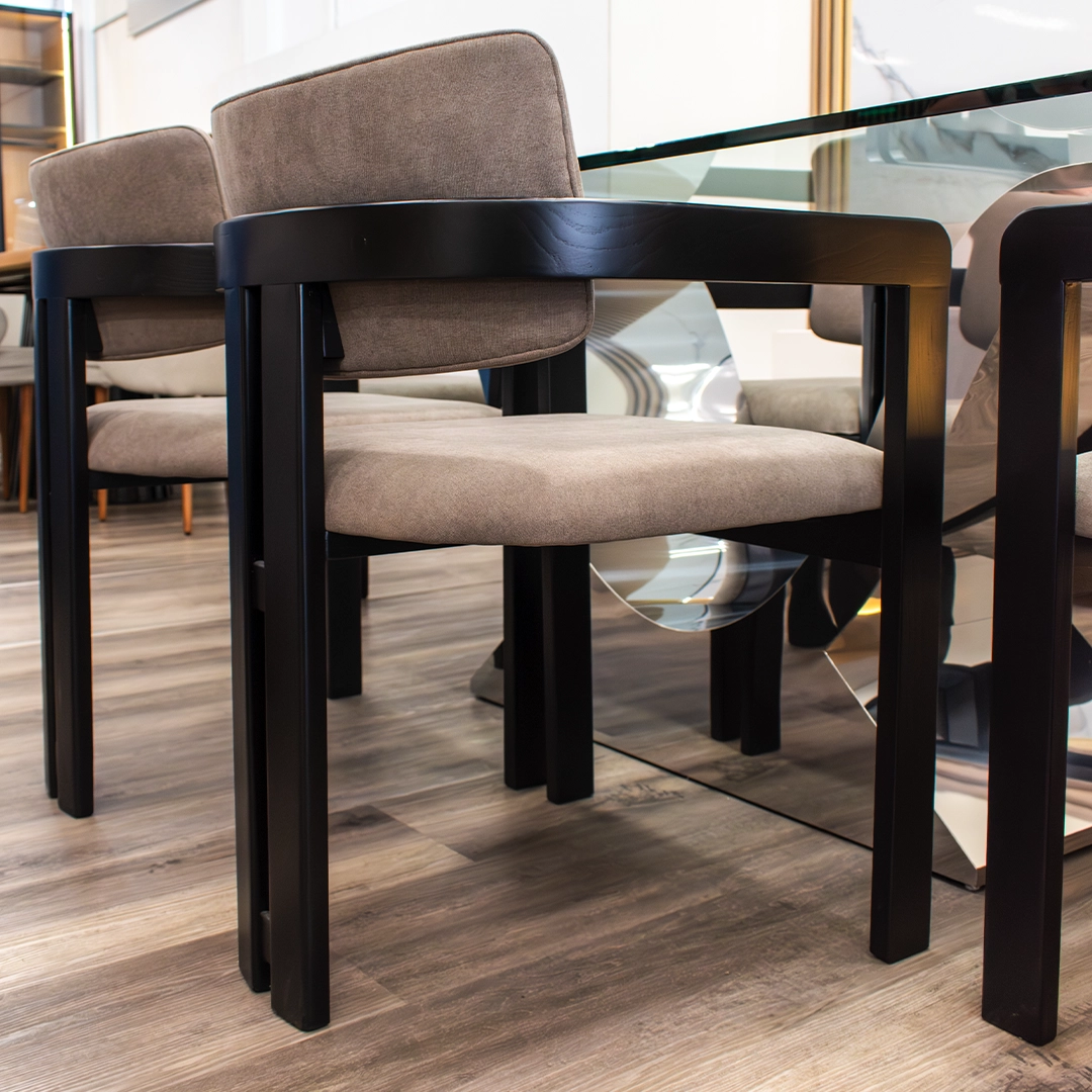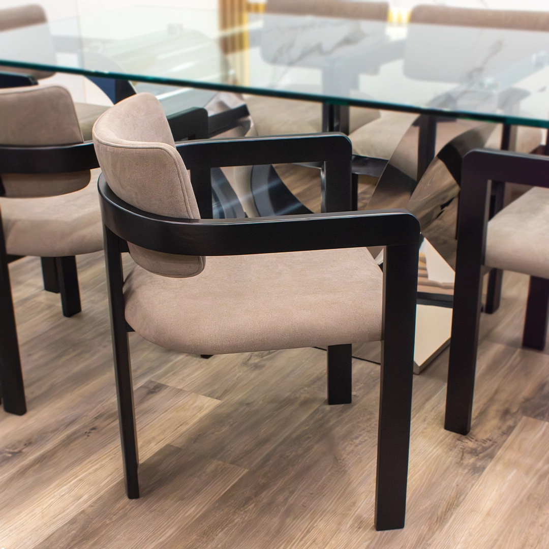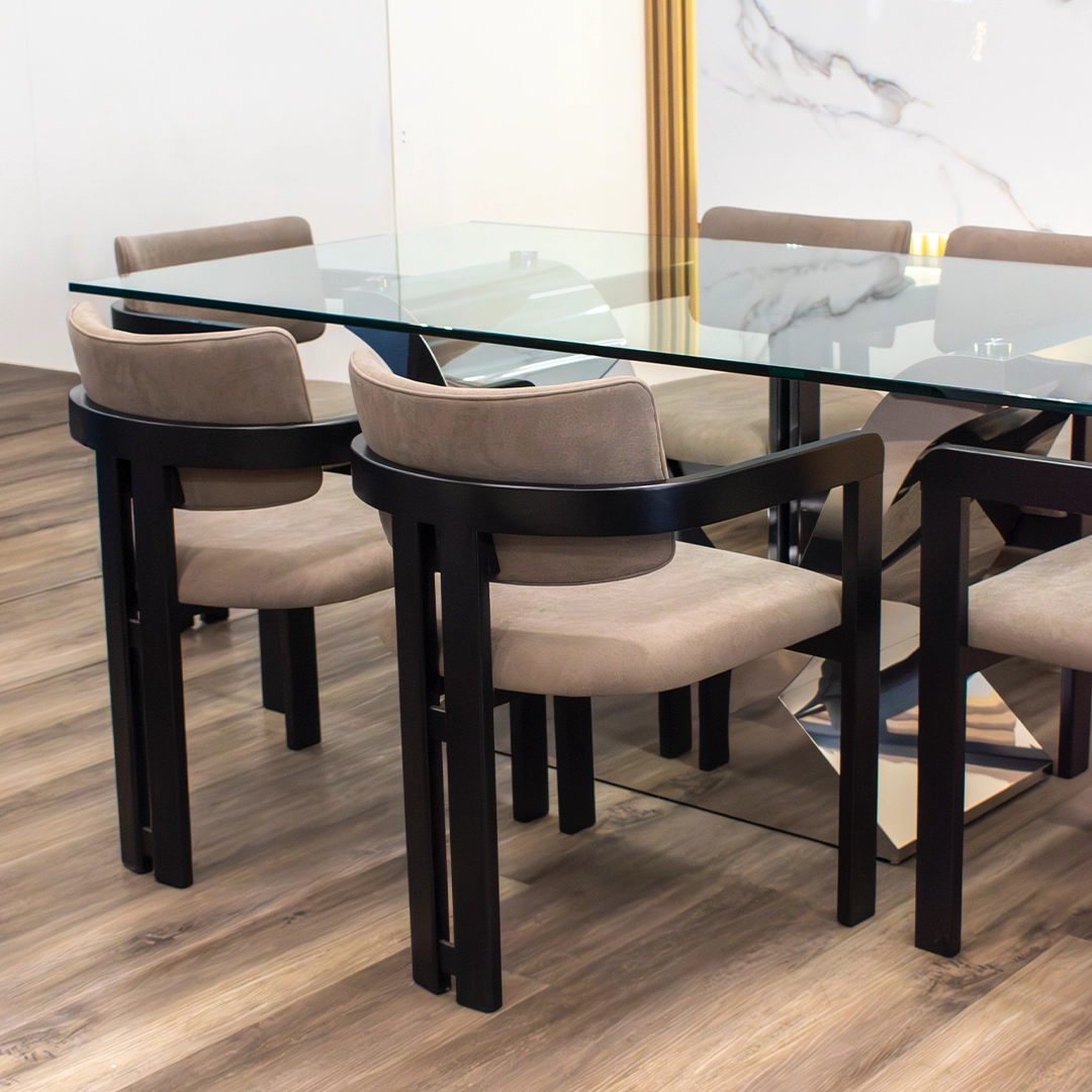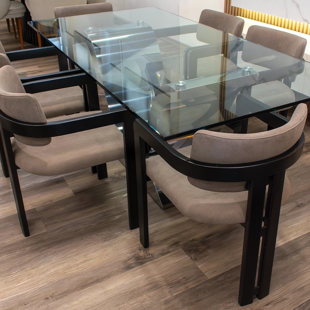 Este juego de comedor combina elegancia y funcionalidad con un diseño contemporáneo. La mesa Art. C045 cuenta con una tapa de vidrio templado de 15 mm que aporta liviandad visual y resistencia, apoyada sobre una base de acero inoxidable que le da un toque sofisticado y moderno. Se acompaña de seis sillas Victoria tapizadas en pana antimancha —ideales para el uso diario— con patas que podés elegir entre terminación lustrada o laqueada. Disponible en varias medidas para adaptarse a diferentes espacios, este conjunto es perfecto para quienes buscan estilo y confort en su comedor.