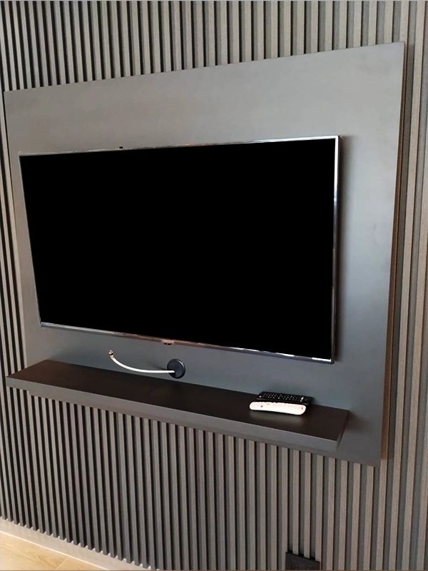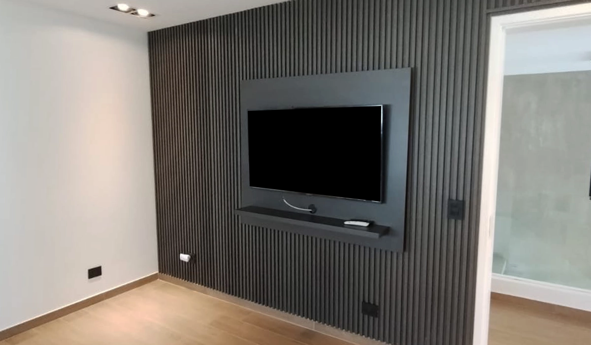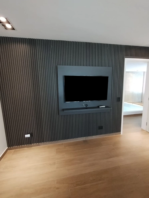En esta entrega el foco estuvo puesto en transformar un plano simple en un elemento de diseño con fuerte identidad visual. El revestimiento listonado vertical en tono oscuro redefine por completo el ambiente, aportando profundidad, textura y sofisticación.